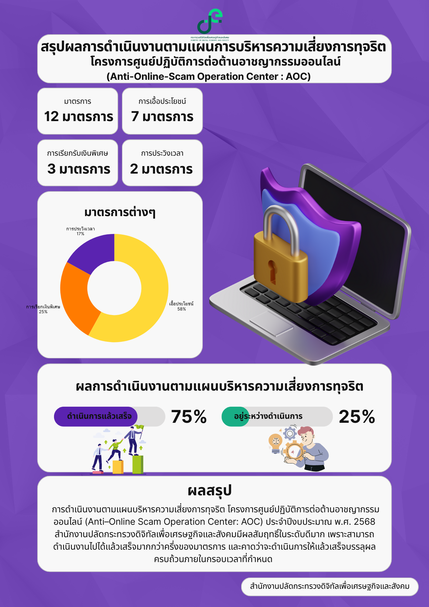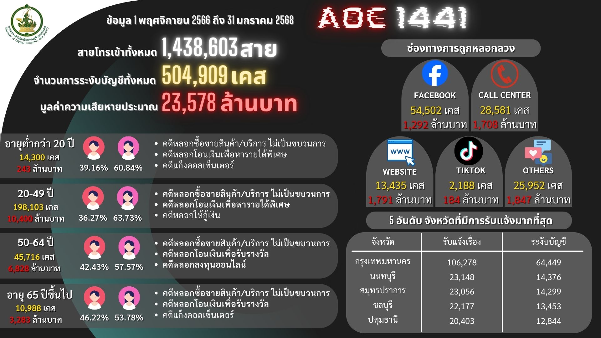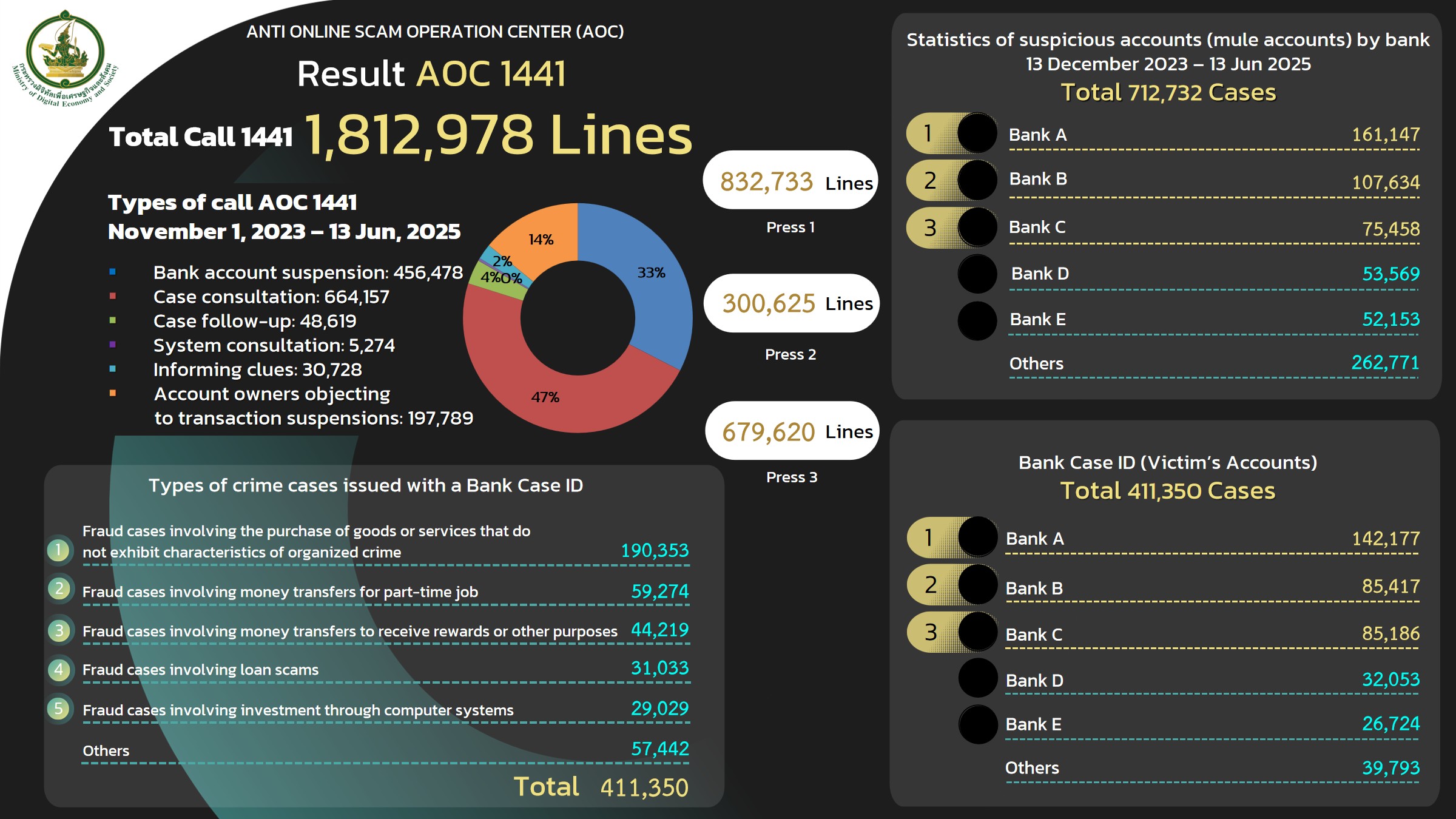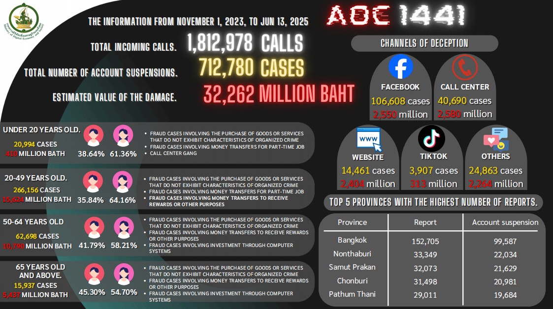The Anti Online Scam Operation Center (AOC 1441), operating under the Ministry of Digital Economy and Society, was established as a One-Stop Service Center to assist the public efficiently and promptly suspend suspicious accounts.