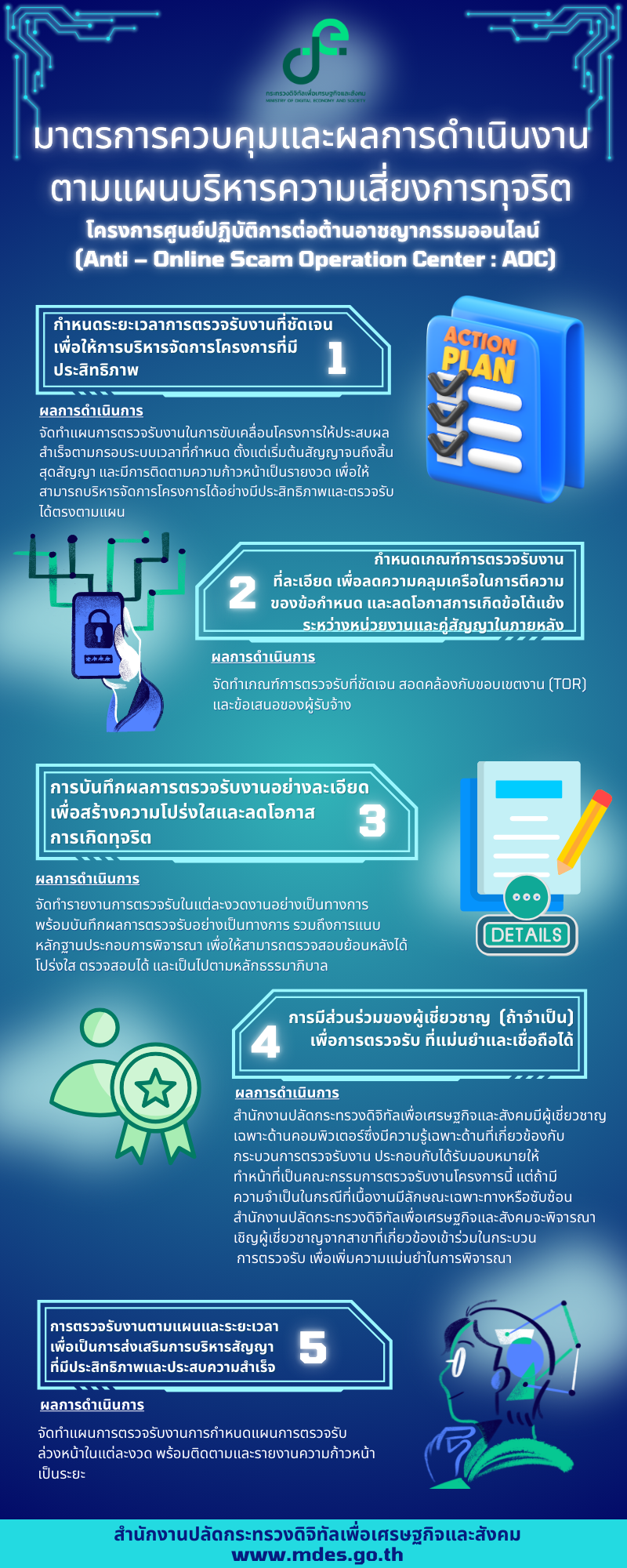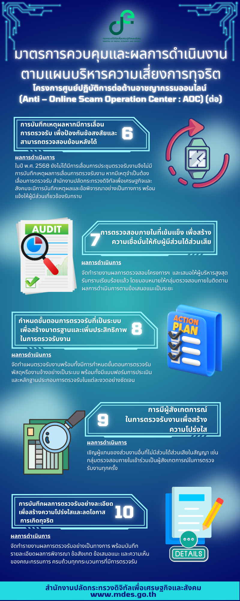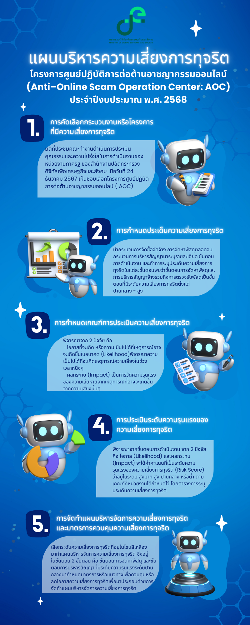 | จากปัญหาการทุจริตที่ผ่านมา มีความรุนแรงอย่างต่อเนื่อง คณะรักษาความสงบแห่งชาติได้มีคำสั่งที่ ๖๙/๒๕๕๗ เรื่อง มาตรการป้องกันและแก้ไขปัญหาการทุจริตประพฤติมิชอบ ลงวันที่ ๑๘ มิถุนายน ๒๕๕๗ ให้ทุกส่วนราชการและหน่วยงานของรัฐกำหนดมาตรการหรือแนวทางการป้องกันและแก้ไขปัญหาการทุจริตประพฤติมิชอบในหน่วยงาน โดยมุ่งการสร้างธรรมาภิบาลในการบริหารงาน และส่งเสริมการมีส่วนร่วมจากทุกภาคส่วนในการตรวจสอบ เฝ้าระวังเพื่อสกัดกั้นมิให้เกิดการทุจริตประพฤติมิชอบ รัฐบาลได้เห็นถึงความสำคัญของการแก้ไขปัญหาการทุจริต ซึ่งได้กำหนดเป็นวาระแห่งชาติ โดยรัฐบาลได้เสริมสร้างกลไกขับเคลื่อนในการป้องกันและแก้ไขปัญหาการทุจริต ขึ้นมา ๓ ระดับ คือ คณะกรรมการต่อต้านการทุจริตแห่งชาติ เป็นกลไกระดับนโยบาย มีนายกรัฐมนตรี/หัวหน้าคณะรักษาความสงบแห่งชาติ เป็นประธาน กรรมการจัดตั้งศูนย์อำนวยการต่อต้านการทุจริตแห่งชาติให้เป็นกลไกขับเคลื่อนภาพรวมระดับประเทศ และกลไกระดับปฏิบัติการ โดยการออกมาตรการเพิ่มประสิทธิภาพศูนย์ปฏิบัติการต่อต้านการทุจริต ซึ่งประจำอยู่ทุกส่วนราชการระดับกระทรวง หรือเทียบเท่า ปัจจุบันมีจำนวน ๓๕ ศูนย์ ให้เป็นกลไกประสานงาน กำกับ ติดตาม และรายงานผลการดำเนินงานที่เกี่ยวข้องกับนโยบาย ข้อสั่งการ ในการป้องกันและแก้ไขปัญหาการทุจริต กับหน่วยงานภายใต้กำกับทั้งหมด ซึ่งได้แก่หน่วยงานส่วนกลาง ส่วนภูมิภาค ส่วนท้องถิ่น รวมทั้ง รัฐวิสาหกิจ และองค์การมหาชน โดยมีสำนักงานคณะกรรมการป้องกันและปราบปรามการทุจริตในภาครัฐ เป็นกลไกขับเคลื่อนประสาน กำกับ ติดตามผลการปฏิบัติงานของศูนย์ปฏิบัติการต่อต้านการทุจริต ในฐานะที่สำนักงาน ป.ป.ท. เป็นฝ่ายเลขานุการของคณะกรรมการต่อต้านการทุจริตแห่งชาติ ตามกฎกระทรวงแบ่งส่วนราชการสำนักงานปลัดกระทรวง กระทรวงดิจิทัลเพื่อเศรษฐกิจและสังคม (ฉบับที่ 3) พ.ศ. 2567 ประกาศ ณ วันที่ 7 มีนาคม 2567 ให้ศูนย์ปฏิบัติการต่อต้านการทุจริต เป็นหน่วยงานหลักในการบูรณาการและขับเคลื่อนแผนปฏิบัติการที่เกี่ยวข้องกับการต่อต้านการทุจริตและประพฤติมิชอบ และการส่งเสริมคุณธรรมและจริยธรรมในกระทรวง รับผิดชอบงานขึ้นตรงต่อปลัดกระทรวง โดยมีหน้าที่และอำนาจ ดังนี้ 1. เสนอแนะต่อปลัดกระทรวงเกี่ยวกับการป้องกันและปรามปราบการทุจริตและประพฤติมิชอบของส่วนราชการในสังกัด ประเมินความเสี่ยงและกำหนดมาตรการบริหารความเสี่ยงเพื่อลดและปิดโอกาสการทุจริตและประพฤติมิชอบ รวมทั้งจัดทำแผนปฏิบัติการที่เกี่ยวข้องกับการต่อต้า